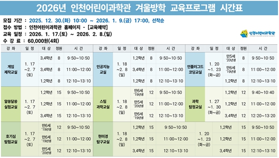 [무한뉴스=정승훈 기자] 인천시설공단 인천어린이과학관은 겨울방학을 맞이해 어린이들의 과학적 탐구 능력을 증진할 수 있는 '2026년 겨울방학 교육프로그램'을 내달 17일부터 2월 8일까지 운영한다.
