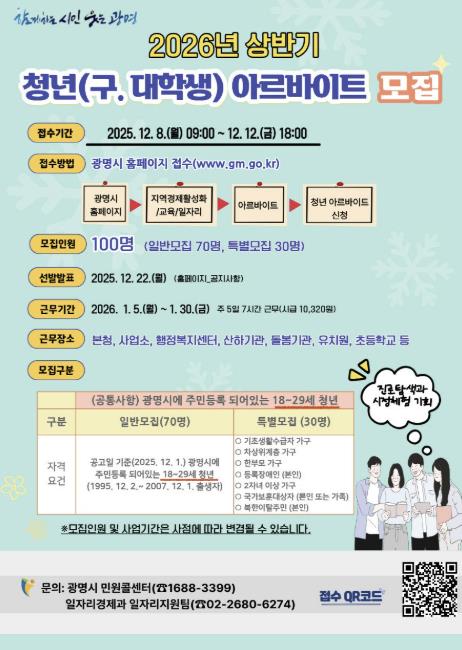 [무한뉴스=정승훈 기자] 광명시는 오는 8일부터 12일까지 ‘2026년 상반기 청년 아르바이트’ 참여자 100명을 모집한다.