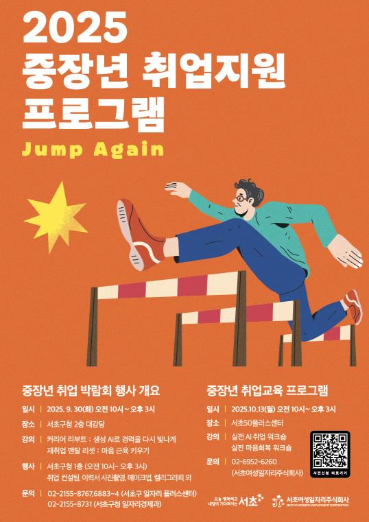 [무한뉴스=정승훈 기자] 서울 서초구는 중장년의 구직 활동을 응원하기 위해 오는 30일 취업지원 프로그램 ‘점프 어게인(JUMP AGAIN)’을 개최한다고 밝혔다.