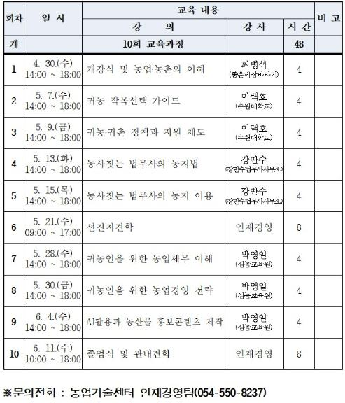 교육은 4월 30일부터 6월 11일까지 총 10회차로 진행될 예정이며 문경시 농업인 및 귀농 예정자를 대상으로 농촌에 정착하고자 하는 의지를 고취시키기 위해 귀농‧귀촌 관련 정책과 농지법, 경영관리 등 실용적인 내용으로 편성됐다.