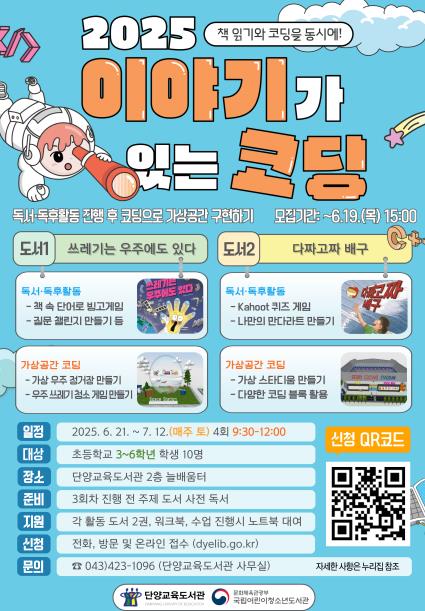 [무한뉴스=정민정 기자] 단양교육도서관이 국립어린이청소년도서관에서 주최하는‘2025년 이야기가 있는 코딩’운영기관 공모사업에 선정됐다. 해당 공모사업은 아이들의 독서에 대한 흥미를 높이는 동시에 코딩과 메타버스 활용 능력을 증진함을 목적으로 한다.