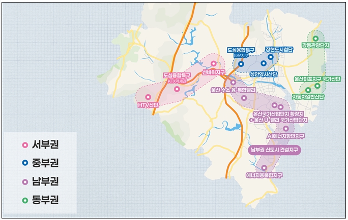 한편 울산경제자유구역은 최근 케이티엑스(KTX)울산역 복합특화지구가 추가 지정되면서 현재 ▲수소산업거점지구(테크노산단) ▲일렉드로겐오토밸리(이화일반산단) ▲연구개발 사업 지구(R·D 비즈니스 밸리)(UNIST·KTX역세권·HTV 일원) ▲케이티엑스(KTX)울산역 복합특화지구 등 총 4개 지구(6.28㎢)를 운영 중이다.