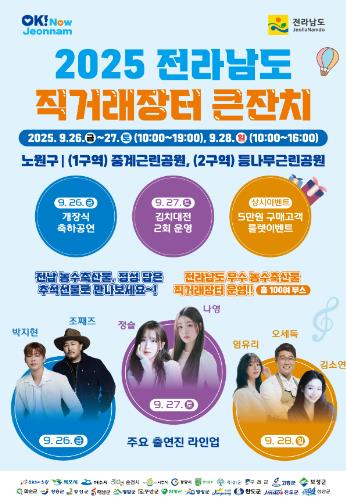 [무한뉴스=정민정 기자] 전라남도는 청정 자연에서 생산된 우수 농수축산물을 직접 선보이고, 판로를 확대하기 위해 26일부터 28일까지 3일간 서울시 노원구 중계근린공원과 등나무근린공원에서 대규모 직거래장터 큰잔치를 개장한다고 밝혔다.