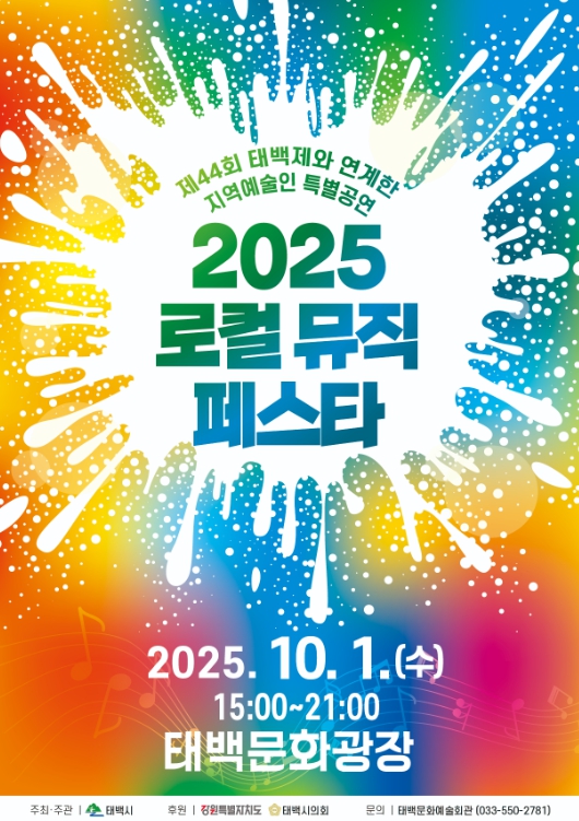 [무한뉴스=정민정 기자] 태백시는 제44회 태백제와 연계한 지역예술인 특별공연 '2025 로컬 뮤직 페스타'를 오는 10월 1일 오후 3시부터 9시까지 태백문화광장에서 개최한다고 밝혔다.