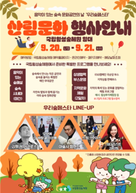 이수성 숲체원장은 “국립횡성숲체원은 산림교육과 산림치유 서비스 제공 기관으로, 이번에는 산림 문화공간으로 확장하여 국민 누구나 함께 즐길 수 있는 축제를 준비했다”며, “특히 장애인 가족과 일반 가족이 함께 어우러지는 무대를 통해 모두가 차별 없이 문화를 체험하는 자리가 되길 바란다”고 말했다.