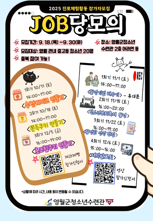 [무한뉴스=정민정 기자] 영월군청소년수련관은 9월 18일~9월 30일까지 '2025년 진로체험활동 “JOB당모의”' 참가자를 모집한다.