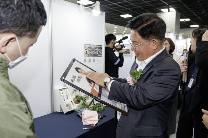 ▲ 박강수 마포구청장이 장애인 예술인이 만든 작품을 감상하고 있다. |
