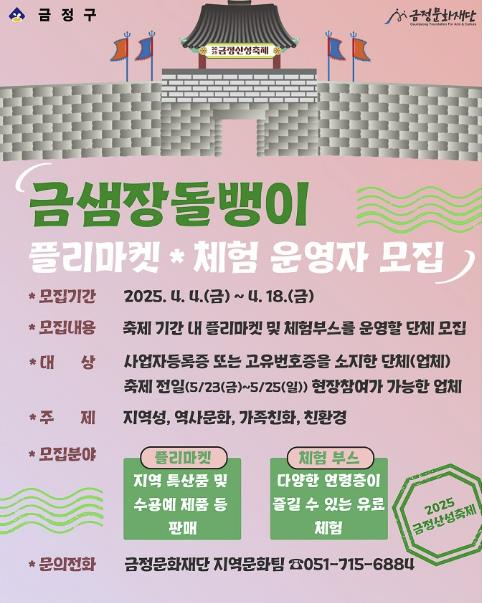 [무한뉴스=최진수 기자] 부산시 금정구 금정문화재단은 오는 5월 23일부터 5월 25일까지 3일간 열리는 2025 금정산성 축제의 ‘금샘 장돌뱅이’프로그램에 참여할 플리마켓 및 체험 부스 운영자를 4월 4일부터 4월 18일까지 모집한다고 밝혔다.