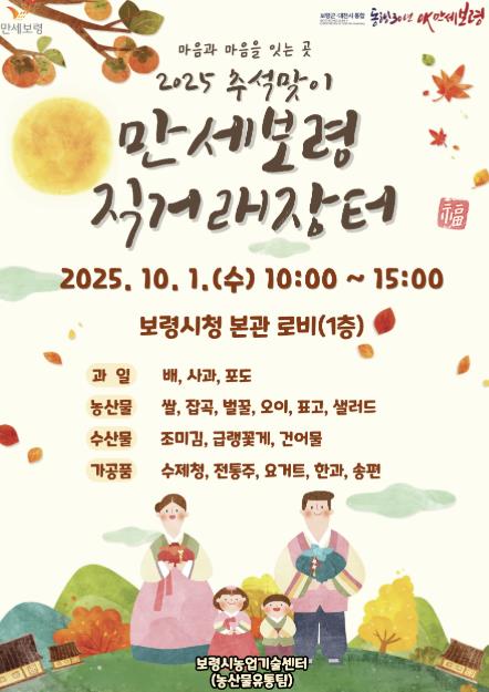 [무한뉴스=정민정 기자] 보령시는 추석을 맞아 10월 1일 보령시청 본관 1층 로비에서 ‘2025 추석맞이 만세보령 농특산물 직거래장터’를 운영한다고 밝혔다.