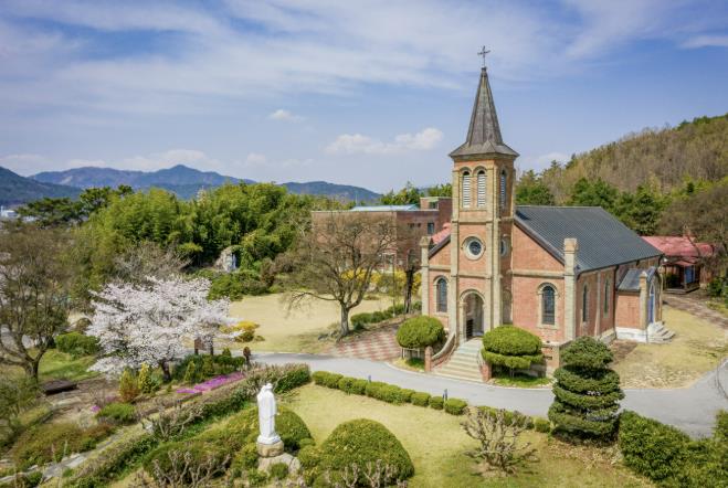 ▲ 하늘과 산을 배경으로 우뚝 선 가실성당 전경. 드라마 촬영 이후‘아이유 결혼식 성당’으로 알려지며 전국적인 관심을 모으고 있다. 성당 앞뜰에는 성모상과 벚꽃나무가 조화를 이루고 있다. |