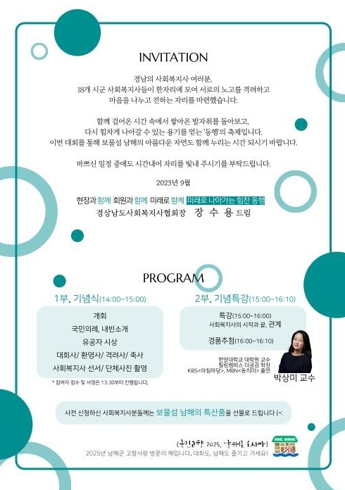 [무한뉴스=최진수 기자] ‘제27회 경상남도사회복지사대회’가 오는 10월 17일 ‘함께 걷는 우리의 길, 동행’이라는 주제로 남해군에서 개최된다.