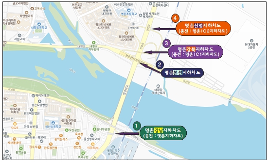 [무한뉴스=최진수 기자] 울산시는 유사한 명칭을 사용해 위치 혼선 우려가 컸던 명촌교 일대 산업로, 강남·강북로에 위치한 4개 지하차도에 대해 명칭을 정비했다고 밝혔다.