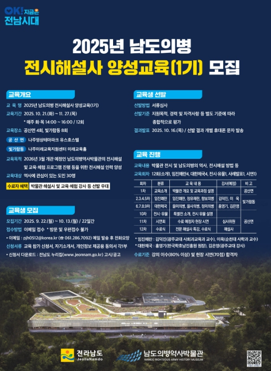 [무한뉴스=정민정 기자] 전라남도는 2026년 3월 개관 예정인 남도의병역사박물관에서 활동할 전시해설사와 교육·체험 강사 양성을 위해 오는 10월 13일까지 교육생 30명을 모집한다고 밝혔다.