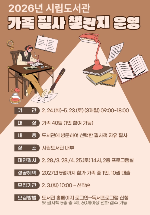 참여 방법은 2026년 2월 24일부터 5월 23일까지 시립도서관을 방문해 접수 시 선택한 필사책을 종합자료실에서 제공받아 도서관 내에서 필사 후 반납하면 된다.