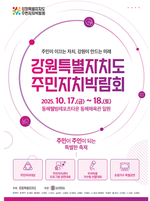 [무한뉴스=정민정 기자] 강원특별자치도는 10월 17일부터 18일까지 동해시 동해체육관 일원에서 '2025 강원특별자치도 주민자치박람회'를 개최한다고 밝혔다.