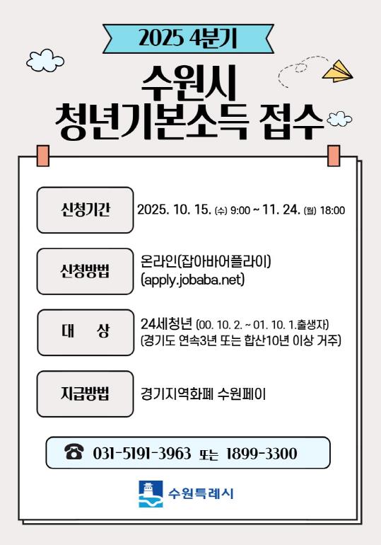 [무한뉴스=양현명 기자] 수원특례시는 10월 15일 오전 9시부터 11월 24일 오후 6시까지 24세 청년을 대상으로 ‘2025년 4분기 청년기본소득’ 신청을 받는다.