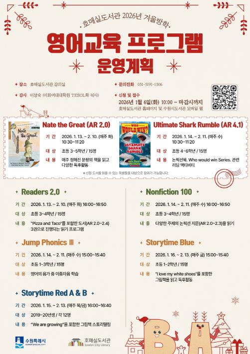 [무한뉴스=양현명 기자] 수원시 호매실도서관이 겨울방학 기간 진행하는 영어교육프로그램 참가자를 모집한다. 이성숙 강사(이화여대 TESOL학 석사)가 강의한다.