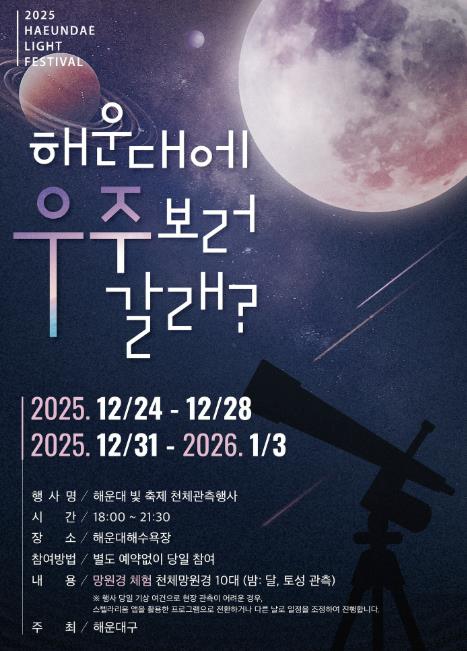 [무한뉴스=최진수 기자] 해운대구가 해운대빛축제 특별 이벤트 ‘우주 보러 갈래’를 12월 24~28일, 12월 31일~1월 3일에 운영한다.