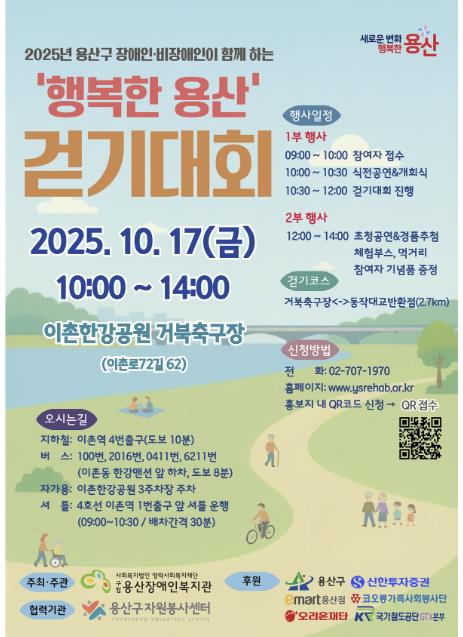 [무한뉴스=정승훈 기자] 서울 용산구가 오는 17일 오전 10시 이촌한강공원 거북축구장 및 산책로 일대에서, 구립용산장애인복지관 주최로 열리는 ‘2025 장애인과 비장애인이 함께 하는 행복한 용산 걷기대회’를 후원한다.