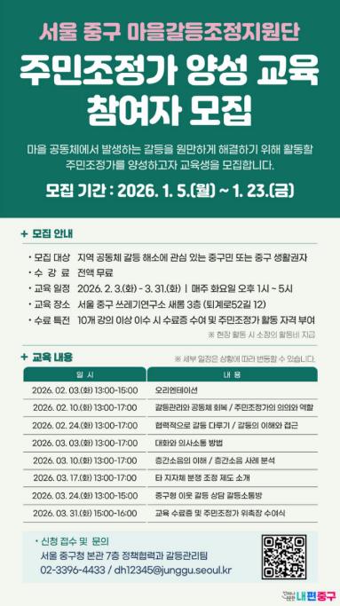 [무한뉴스=정승훈 기자] 서울 중구가 주민 스스로 갈등을 조정하고 마을의 신뢰를 회복할 수 있도록 돕는 ‘주민조정가’를 양성해 따뜻한 공동체 문화를 만들어가고 있다. 구는 2024년 마을갈등조정지원단 제1기 주민조정가에 이어, ‘제2기 주민조정가 신규 양성 교육’에 참여할 교육생을 공개 모집한다.