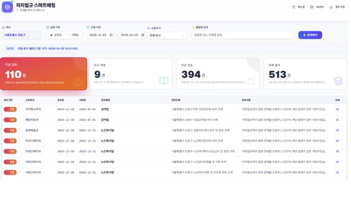 기존에는 수기 검색과 점검에 많은 인력과 시간이 소요돼 입법 시차가 발생하거나 누락의 우려가 있었으나, 이번 시스템은 569개 자치법규(조례·규칙)에 인용된 상위법령을 자동 데이터베이스화하고, 법제처의 개정 정보를 교차 분석해 각 자치법규에 미치는 영향을 긴급 검토, 신규 제정, 단순 참고 등으로 분류한다. 이를 통해 업무 효율성과 법령 관리의 신뢰성을 획기적으로 강화했다.