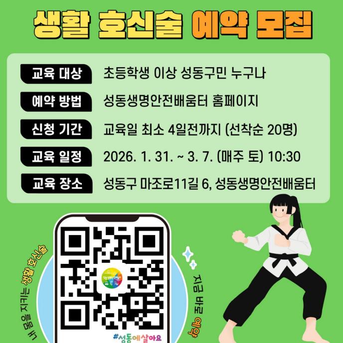 [무한뉴스=정승훈 기자] 서울 성동구가 구민의 생활 안전 역량 강화를 위해 성동생명안전배움터에서 ‘2026년 생활 호신술 안전교육’을 운영한다.