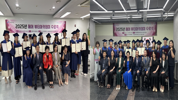 | ▲ 2025년 헤어 뷰티아카데미 수료식(왼쪽 상록구, 오른쪽 단원구)에서 수료자들이 기념촬영을 하고 있다. |