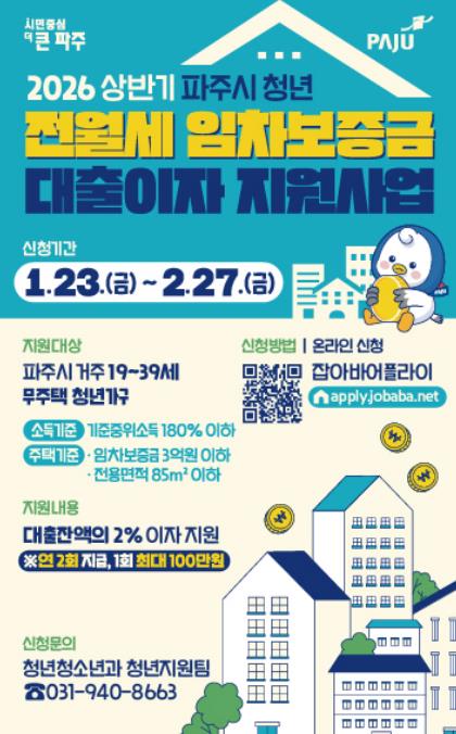 ‘청년 전월세 임차보증금 대출이자 지원’은 파주시에 주민등록을 둔 무주택 가구 중 제1금융권에서 전월세 보증금 대출을 받은 19~39세 청년에게 대출 잔액의 2% 이자(연 최대 200만 원)를 지원하는 사업으로, 상·하반기 각 10가구를 선정해 최대 100만 원씩 반기별로 총 2회 지급한다.