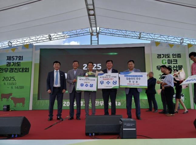 | ▲ 한상춘 한우농가(가운데)가 ‘경기G한우페스타-경기도한우경진대회’에서 암송아지 부문 우수상을 수상하고 있다. |