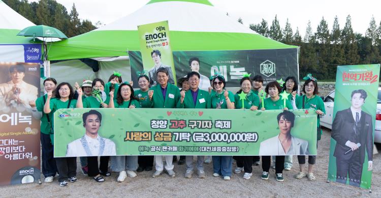 [무한뉴스=정민정 기자] 청양군은 청양고추구기자축제 축하공연에 맞춰 뮤지컬 배우 겸 트로트 가수 에녹의 공식 팬카페 ‘화기에애(대전·세종·충청방)’가 관내 저소득 가구 지원을 위해 성금 300만 원을 기탁했다고 밝혔다.