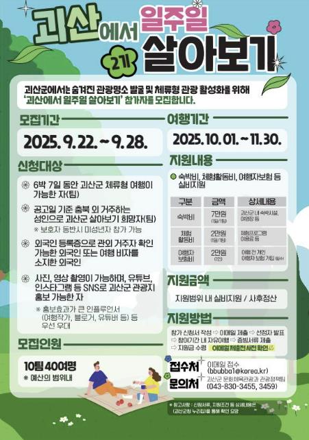 이번 사업은 ‘충북 일단 살아보기’ 사업 일환으로, 괴산의 체류형 관광을 육성해 생활 인구를 늘리고, 지역 내 숨겨진 관광명소를 발굴, 홍보하기 위해 마련됐다.