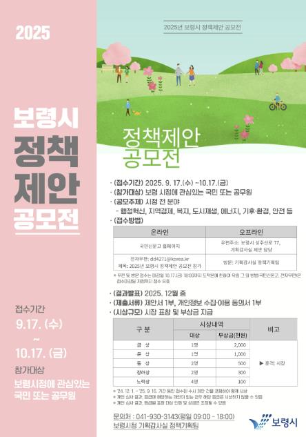 [무한뉴스=정민정 기자] 보령시는 오는 10월 17일까지 ‘2025년 보령시 정책 제안 공모전’을 개최한다고 밝혔다. 이번 공모전은 지역사회 발전과 시정 혁신을 위해 시민들의 다양한 목소리와 창의적인 아이디어를 시정에 적극 반영하고자 마련됐다.