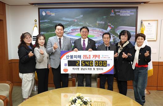 제12대 경상남도의회 이시영 도의원과 봉사단체(영파워)는 이번 대형 산불로 인한 긴급구호 및 피해지역 복구 지원을 위해 성금을 기부함으로써 소중한 나눔을 실천했다.