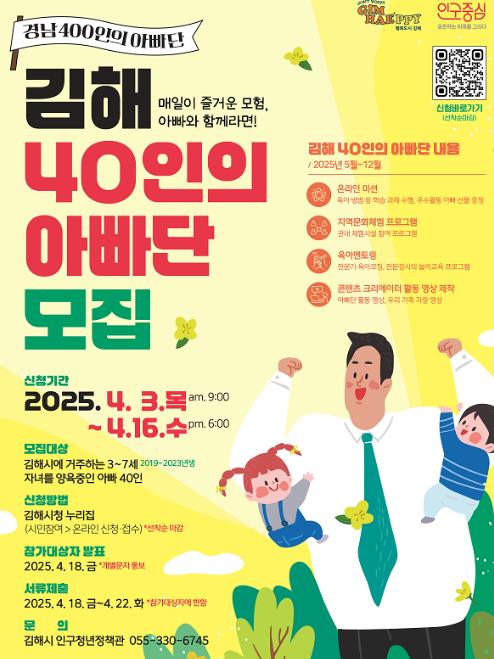 이는 인구감소 위기대응 극복을 위한 경남형 저출생 대응 시범사업의 하나로 2019년 처음 출범한 경남 100인의 아빠단을 올해는 경남 400인의 아빠단으로 확대 운영하면서 김해는 40인의 아빠단을 모집해 운영하기로 했다.