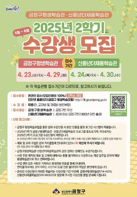 ▲ 부산시 금정구평생학습관·신중년더채움학습관 2025년 2학기(5월~8월) 평생학습관 수강생 모집 안내 |
