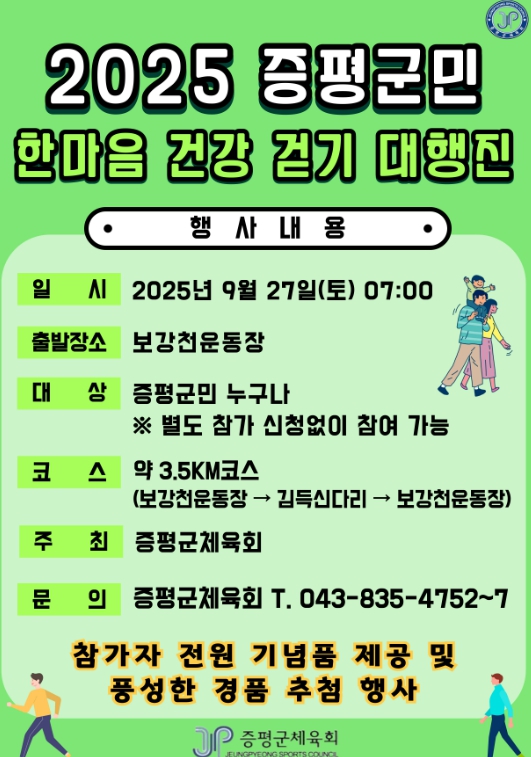 [무한뉴스=정민정 기자] ‘2025 증평군민 한마음 건강걷기대행진’이 오는 27일 오전 7시, 증평 보강천 운동장에서 열린다.