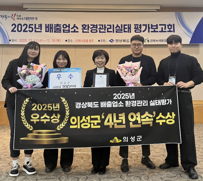 [무한뉴스=최진수 기자] 의성군은 지난 12월 17일 열린 ‘2025년 경상북도 배출업소 환경관리 실태평가’에서 2그룹 1위를 차지하며 도 전체 우수상을 수상했다고 밝혔다.