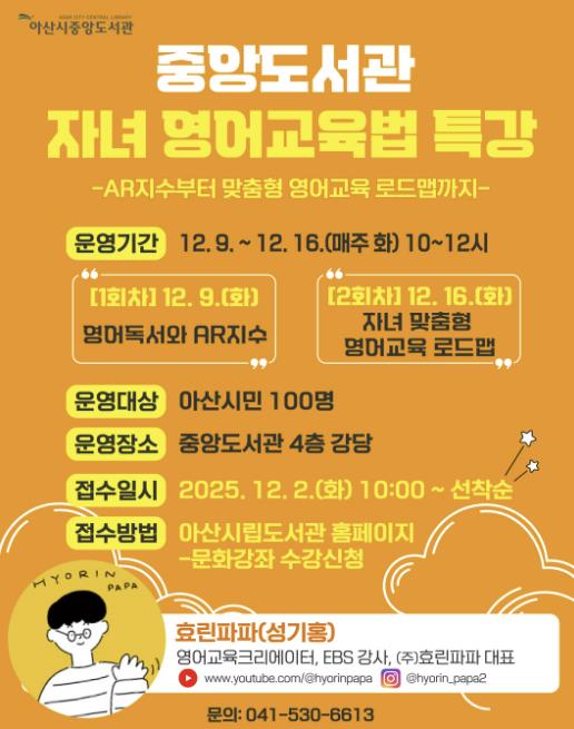 [무한뉴스=정민정 기자] 아산시 중앙도서관은 오는 12월 9일과 16일, 두 차례에 걸쳐 영어교육 전문가 효린파파(성기홍)와 함께하는 자녀 영어교육법 특강을 운영한다.