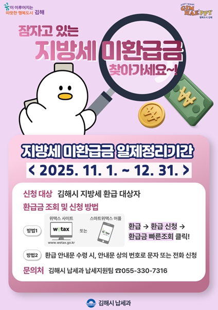 [무한뉴스=최진수 기자] 김해시는 납세자가 돌려받을 지방세 환급금을 제때 찾아갈 수 있도록 11~12월 ‘2025 지방세 미환급금 일제정리 기간’을 운영한다고 31일 밝혔다.