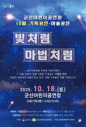 [무한뉴스=정민정 기자] 군산어린이공연장이 오는 10월 18일 어린이들의 상상력과 창의력을 자극하는 특별한 체험형 공연 '빛처럼 마법처럼'을 선보인다.