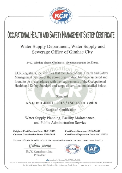 | ▲ 김해시 상수도 분야 ISO 45001(안전보건경영시스템) 인증 |