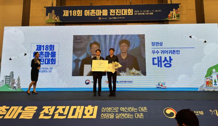 [무한뉴스=정민정 기자] 전라남도해양수산과학원은 오늘 경주에서 열린 제18회 어촌마을 전진대회에서 2020년 전남귀어학교 제2기 수료생인 완도 김진호(46) 씨가 우수 귀어귀촌인 대상에 선정돼 해양수산부 장관 표창을 받았다고 밝혔다.