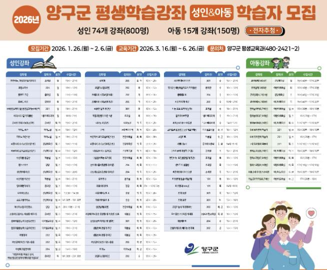 [무한뉴스=정민정 기자] 양구군은 1월 26일부터 2월 6일까지 12일간 상반기 평생교육 프로그램 학습자를 모집한다.