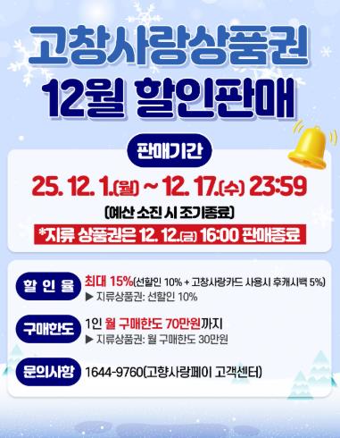 | ▲ 고창군, 12월 고창사랑상품권 최대 15% 할인판매... 12월 17일까지 진행 |