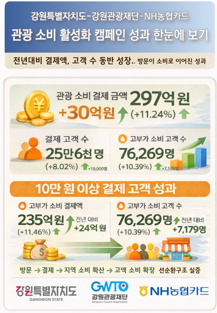 [무한뉴스=정민정 기자] 강원특별자치도와 강원관광재단은 NH농협카드와 함께 추진한 ‘강원 관광소비 활성화 상생 캠페인’ 결과, 전년 동일 기간 대비 관광 소비 금액과 결제 고객 수가 모두 증가하며 실질적인 지역 소비 활성화 성과를 거둔 것으로 나타났다.