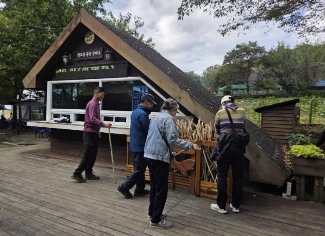 | ▲ 등산객들이 광교산 등산 안내소 앞에 있는 지팡이를 고르고 있다. |