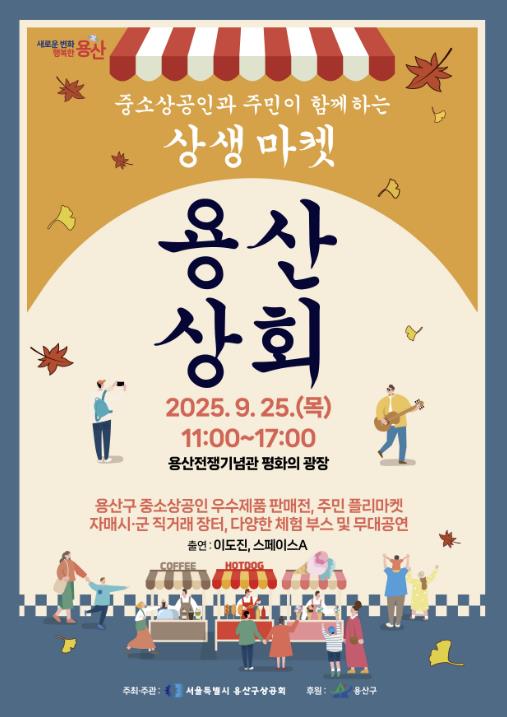 [무한뉴스=정승훈 기자] 서울 용산구가 오는 25일 오전 11시~오후 5시 전쟁기념관(이태원로 29) 평화의 광장에서 (사)용산구상공회 주최로 열리는 중소상공인과 주민이 함께하는 상생마켓 ‘용산상회’를 후원한다.