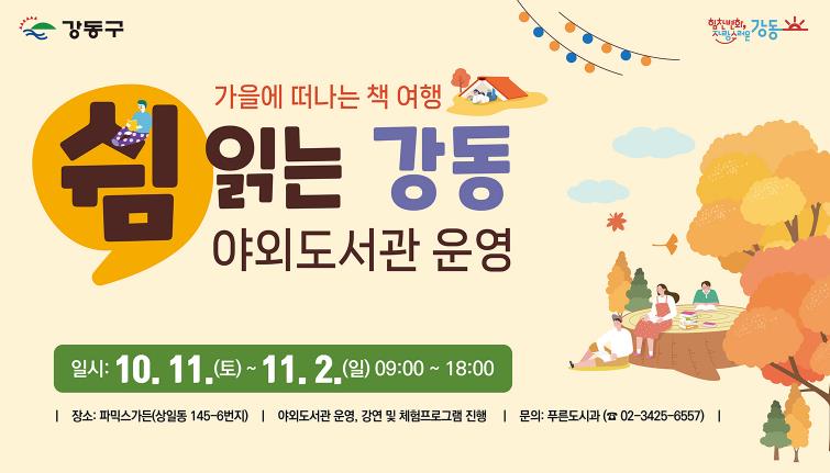 [무한뉴스=박노신 기자] 강동구는 10월 11일부터 11월 2일까지 한 달간 파믹스가든(상일동 145-6)에서 주말 야외 도서관 '쉼 읽는 강동'을 운영한다고 밝혔다.