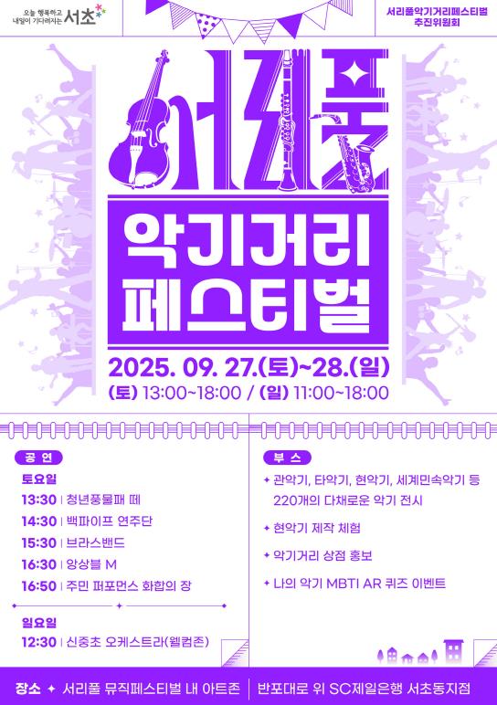 [무한뉴스=정승훈 기자] 서울 서초구는 '2025 서리풀뮤직페스티벌' 기간인 오는 27일부터 28일까지 반포대로 일대에서 ‘제7회 서리풀 악기거리 축제’를 개최한다고 밝혔다. ‘서리풀 악기거리 축제 추진단’이 주최·주관하는 이번 축제는 국내 유일 음악문화지구인 서리풀 악기거리에서 구의 악기거리 인프라를 활용해 모두가 함께 만들어 가는 문화축제다.