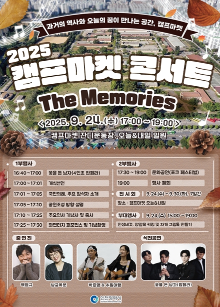 [무한뉴스=정승훈 기자] 인천광역시는 오는 9월 24일 오후 5시, 부평 캠프마켓 개방공간인 잔디운동장에서 ‘2025 캠프마켓 콘서트 The Memories’를 개최한다고 밝혔다.